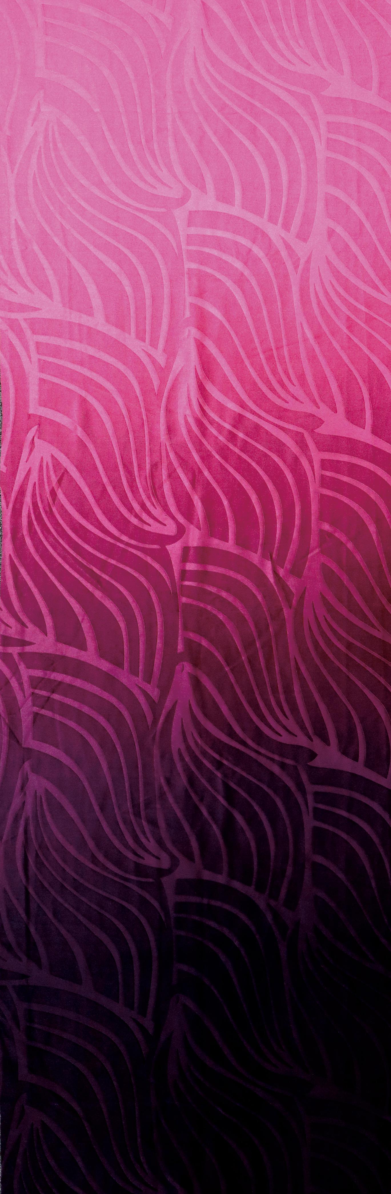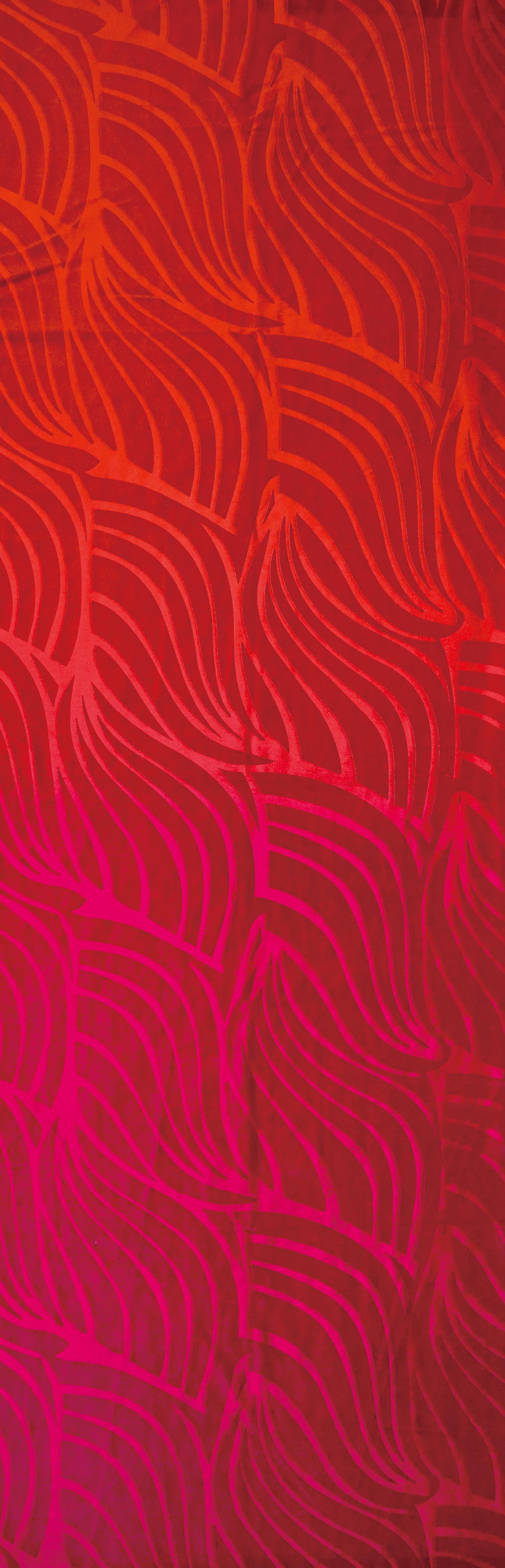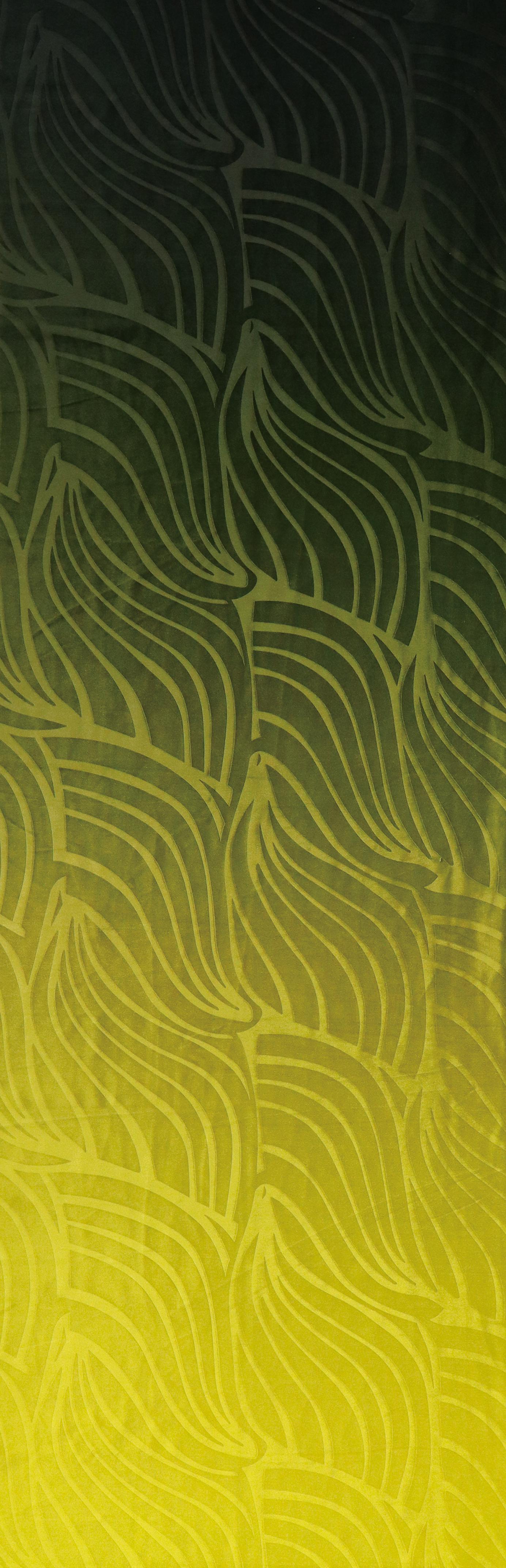 これまでになかった発想で、ベロアに型押しを施し、さらにグラデーションで染め上げました。光の変化に呼応して柄が浮かび上がり、葉が波とともに舞い流れるような新しい表情を生み出します。