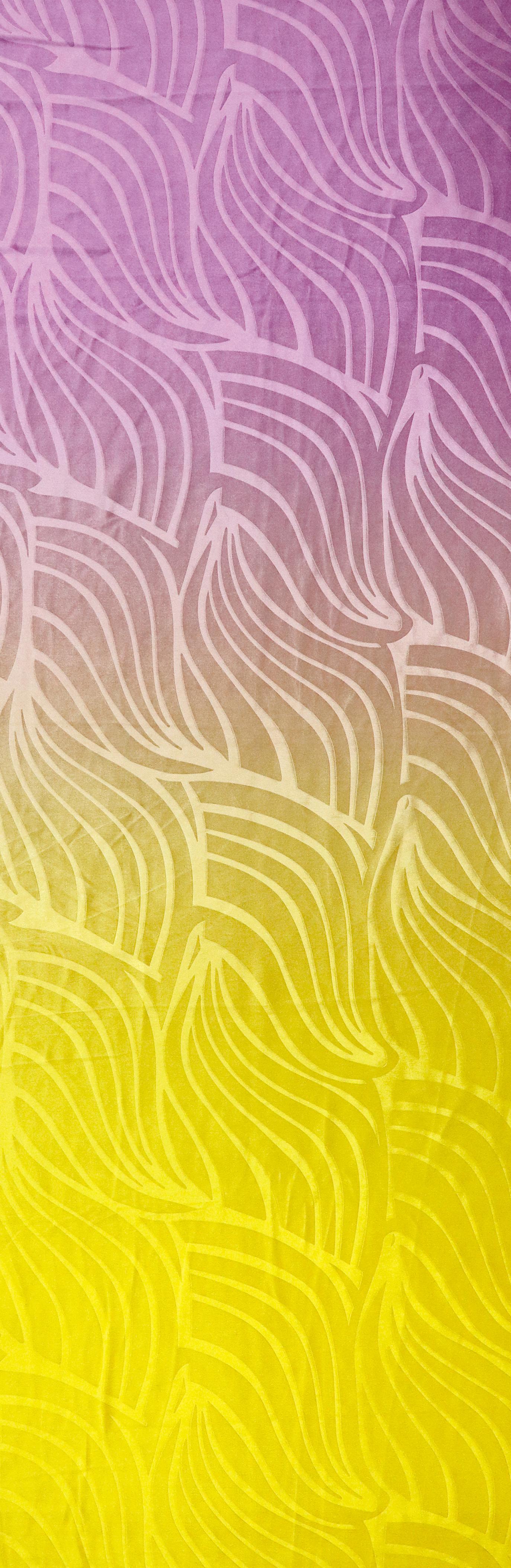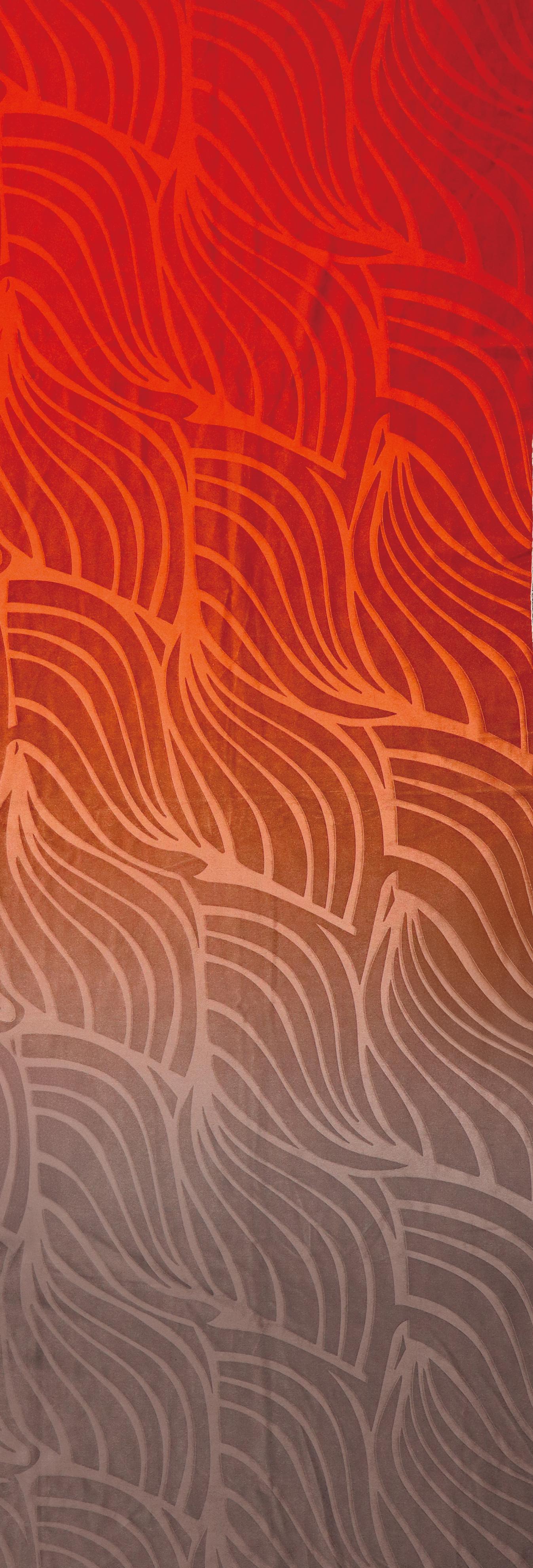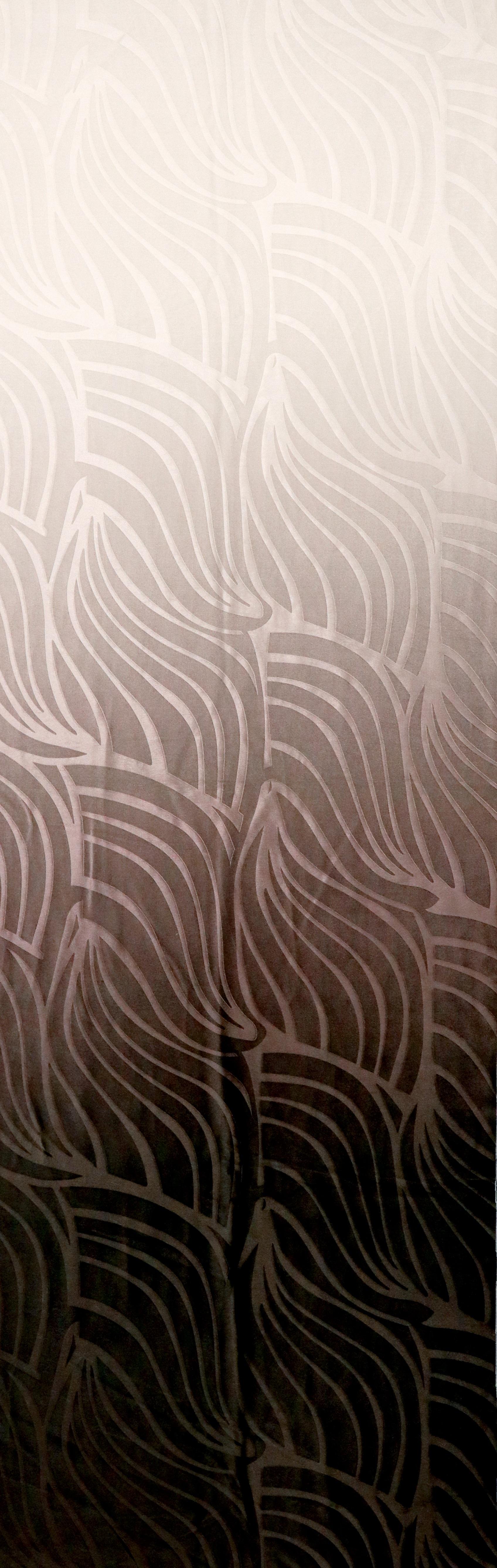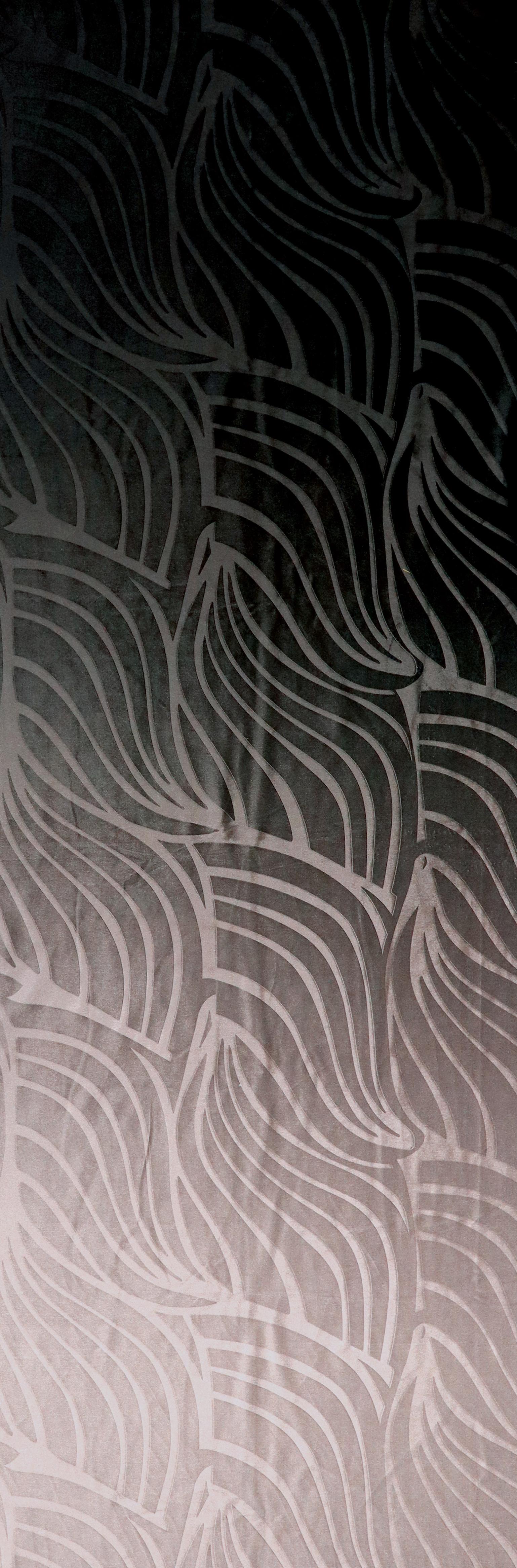 これまでになかった発想で、ベロアに型押しを施し、さらにグラデーションで染め上げました。光の変化に呼応して柄が浮かび上がり、葉が波とともに舞い流れるような新しい表情を生み出します。
